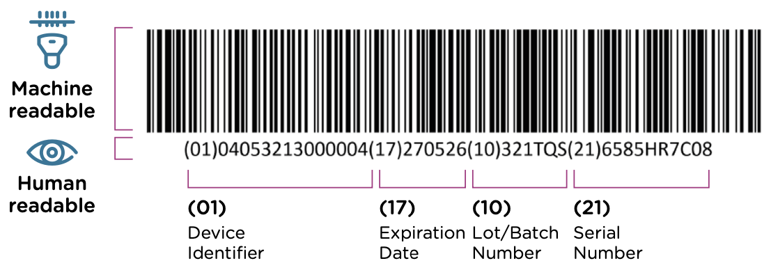 The GUDID was implemented as a part of the FDA’s UDI system. This system requires that each medical device have a unique identification code that is included in the device label (printed on the device itself or its packaging) in both machine and human readable format. An example of a UDI code is included below. The UDI code contains information about the device, the manufacturer, and when/where the device was manufactured.