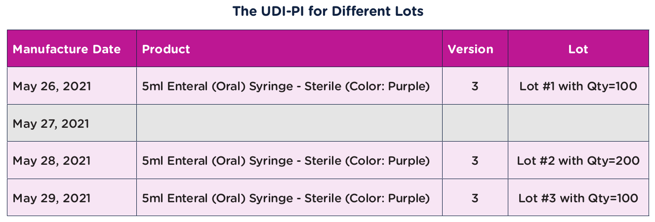 Each time that 5ml Enteral (Oral) Syringe – Sterile (Color: Purple) is manufactured at the same revision, it will get a new UDI-PI per lot. See the graphic below.