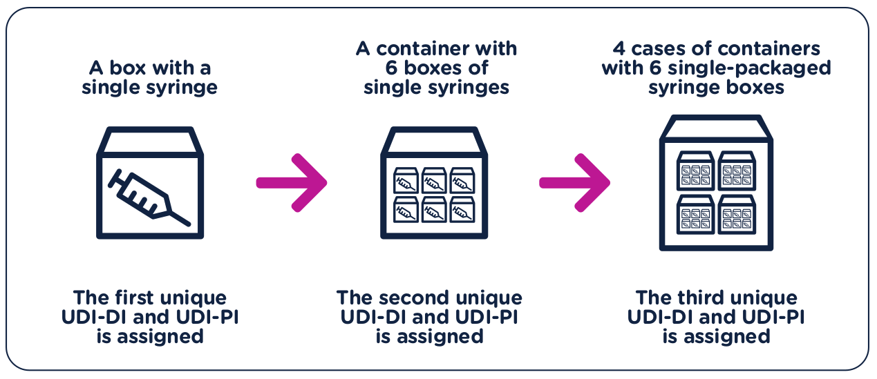 Returning to our earlier example of syringes, if a manufacturer first packages a single sellable syringe into an individual box, this package would receive its own UDI-DI and UDI-PI.